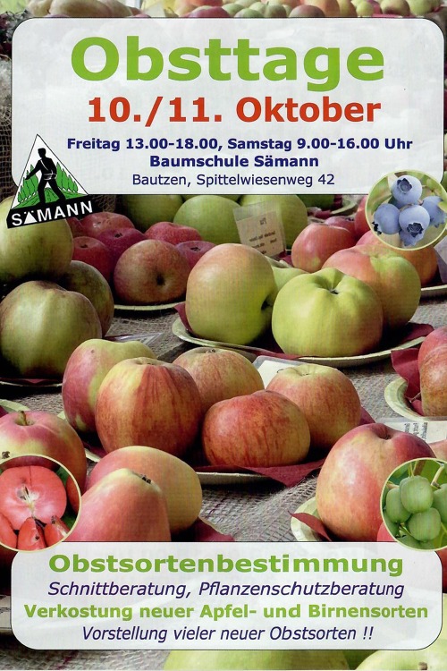 Am 10.und 11. Oktober finden in der Baumschule Sämann die Obsttage statt, mit Beratungen zum Schnitt, Pflanzenschutz, Verkostungen und Vorstellung neuer Obstsorten.